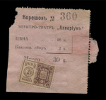 Корешок. Электро-театр «Аквариум». С непочтовой маркой «ВУИМ», 2 копейки — налог на зрелища и увеселения