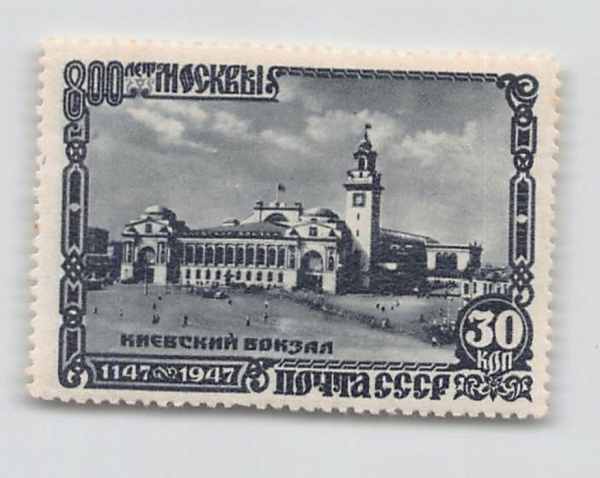 Негашеная почтовая марка. 800-лет Москве. Киевский вокзал 1947 (СССР)