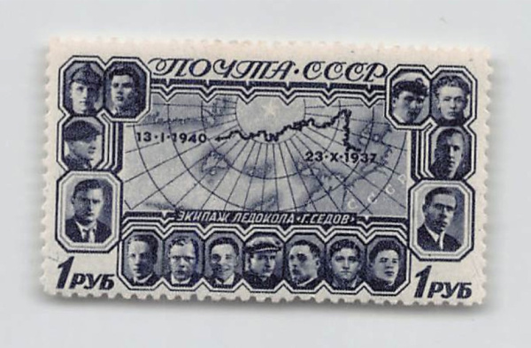 Негашеная почтовая марка. Полярный дрейф ледокола «Георгий Седов». Экипаж ледокола. 1 руб. По каталогу В. Соловьева 1500 руб 1940 (СССР)