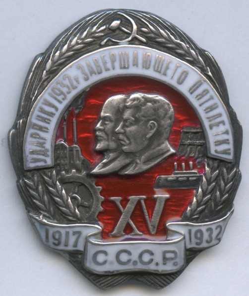 Знак «Знак Ударнику 1932 г. Завершающего Пятилетку». Крепление: винт. Тяжелый, редкий, эмаль. номерной 08421 бронза с глубоким серебрением (СССР)