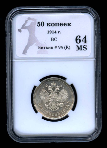 50 копеек — Портрет Николая II. Выпуклый чекан 1914 ВС. В оригинальном сертифицированном слабе® MS 64 (Российская Империя)
