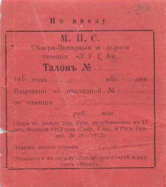 Талон. Северо-Западная железная дорога, станция «Луга» (Российская Империя)