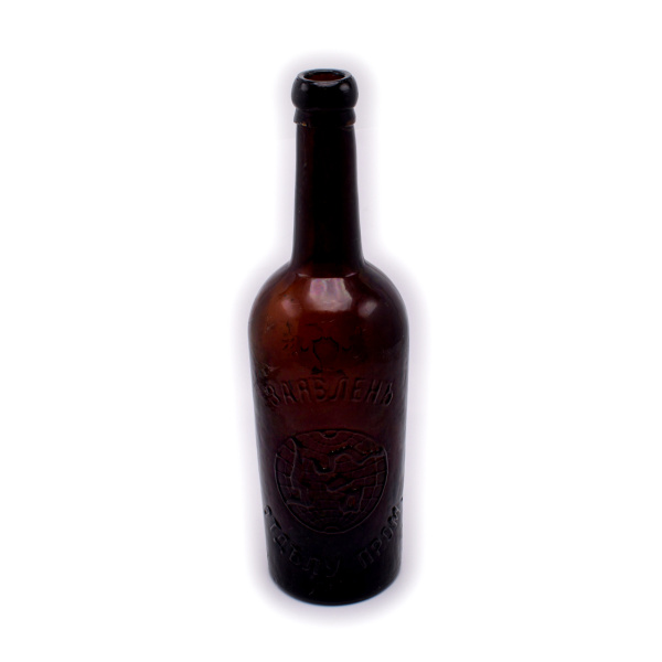 Бутылка стеклянная. Темное стекло. Герб Российской Империи. Размер 8×27 см. Надпись: Заявлен отделу пром. Калинкин. С петербург (Российская Империя)