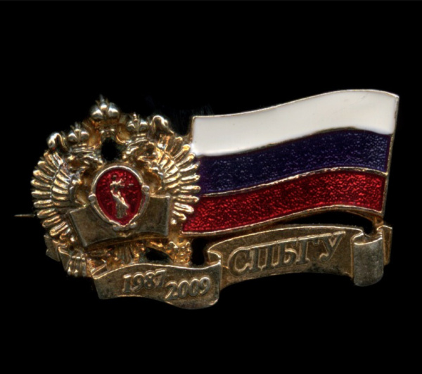 Знак «CПБГУ 1987−2009 Серебро 925 проба Редкость». Крепление: булавка. Тяжелый (Россия)