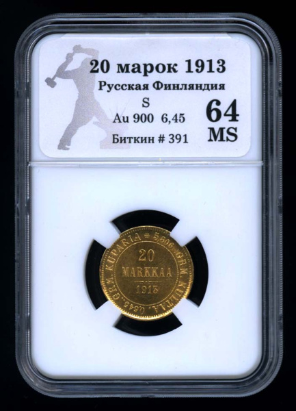20 марок — Для Финляндии 1913 S. В оригинальном сертифицированном слабе® MS 64 (Российская Империя)
