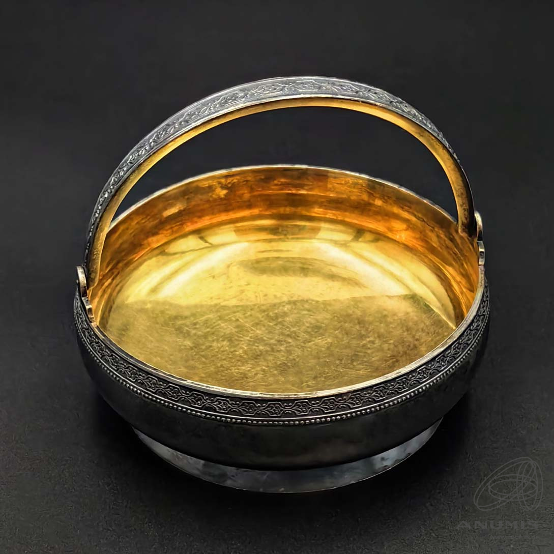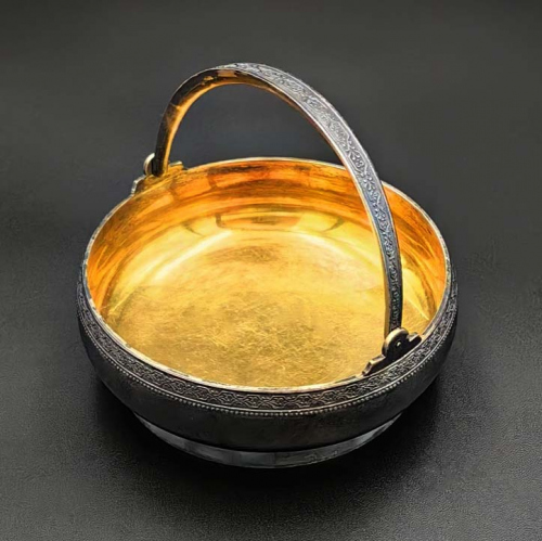 Сахарница. Высота с ручкой 9 см, диаметр 10,5 см. 170.1 гр. Клейма 875 выпуклая звезда, «ТФ9» Таллинская ювелирная фабрика. 1959. Узор по канту и на ручке. Позолота. Состояние превосходное