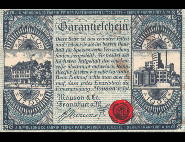 Гарантийный сертификат от немецкой компании J.G. Mouson & Co., производителя парфюмерии и туалетного мыла. Франкфурт-на-Майне 1928