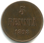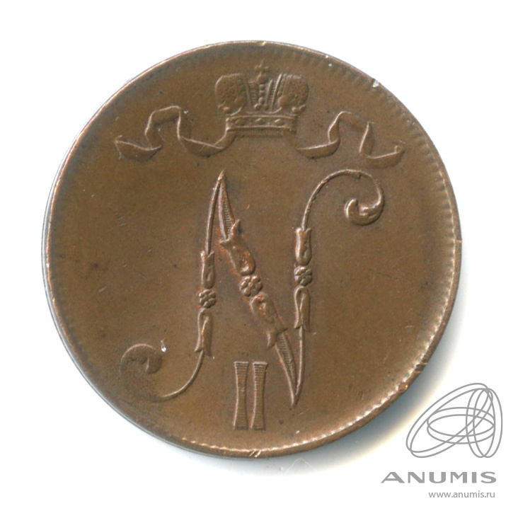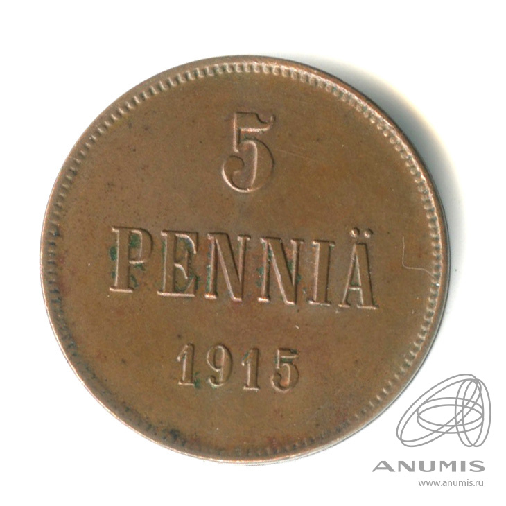 Монета регионального выпуска: 5 пенни 1915 года «Для Финляндии. Вензель Николая II». 5 пенни 1865 — 1917 гг. Российская Империя: Николай II (1894 — 1917). Медь, 6 г, ø 25 мм, Гурт: Гладкий. Тираж: 2078000 шт.