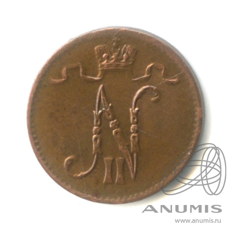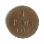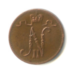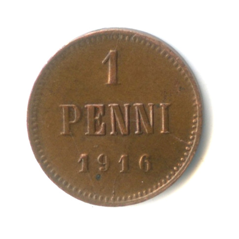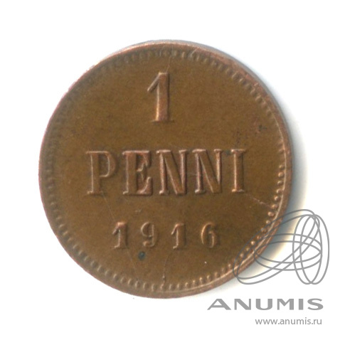 Монета регионального выпуска: 1 пенни 1916 года «Для Финляндии. Вензель Николая II». 1 пенни 1864 — 1917 гг. Российская Империя: Николай II (1894 — 1917). Медь, 1 г, ø 15 мм, Гурт: Гладкий. Тираж: 3040000 шт.