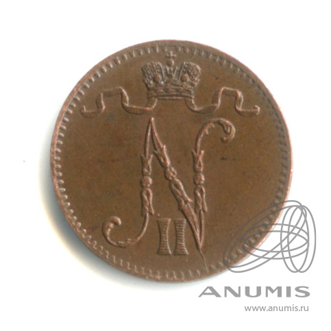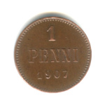 Монета регионального выпуска: 1 пенни 1907 года «Для Финляндии. Вензель Николая II». 1 пенни 1864 — 1917 гг. Российская Империя: Николай II (1894 — 1917). Медь, 1 г, ø 15 мм, Гурт: Гладкий. Тираж: 2484517 шт.