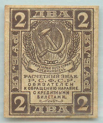 Банкнота регулярного выпуска: 2 рубля 1919 года. Расчетные знаки РСФСР 1919 г. Российская Советская Федеративная Социалистическая Республика: РСФСР (1919 — 1923).