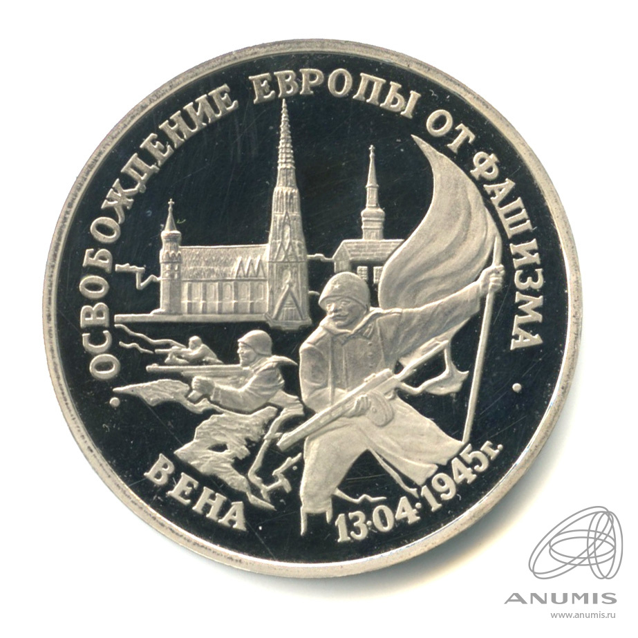 Юбилейная монета: 3 рубля 1995 года «Освобождение Европы от фашизма. Вена». 50 лет Победы в Великой Отечественной Войне. Российская Федерация: Банк России (1992 — 1996). Медь-никель, 14 г, ø 33 мм, Гурт: Надпись. Тираж: 200000 шт. Серия: 50-летие Победы в Великой Отечественной войне.