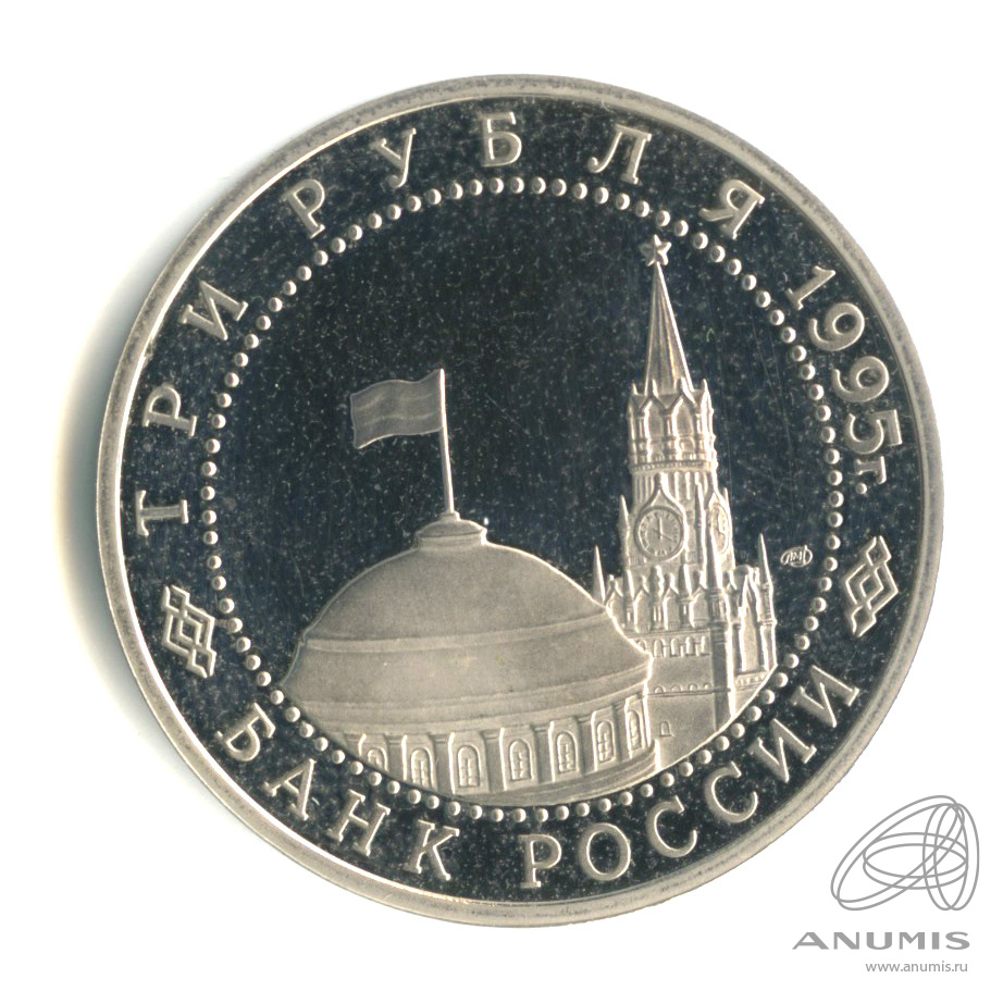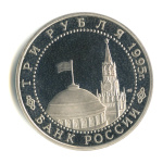 в центре диска — изображения купола здания Сената и Спасской башни Московского Кремля, справа — товарный знак монетного двора. По окружности надписи, обрамлённые кругом из точек: вверху — «ТРИ РУБЛЯ 1995 г.», внизу — «БАНК РОССИИ».