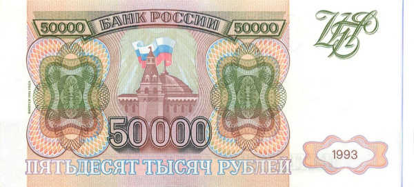 Банкнота регулярного выпуска: 50000 рублей 1994 года «обр. 1993». Билеты Банка России 1994 г. Российская Федерация: Банк России (1992 — 1996).