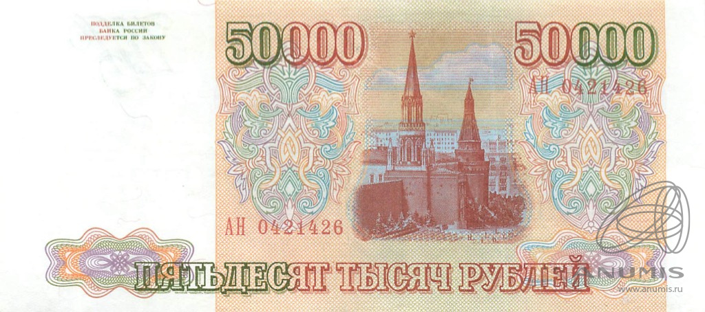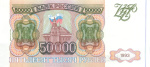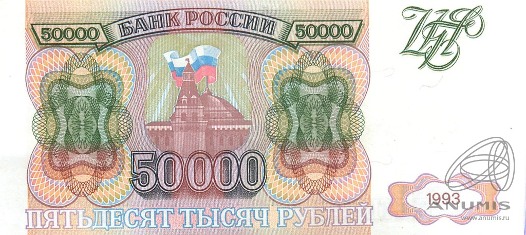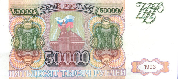 Банкнота регулярного выпуска: 50000 рублей 1993 года. Билеты Банка России 1993 г. Российская Федерация: Банк России (1992 — 1996).