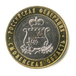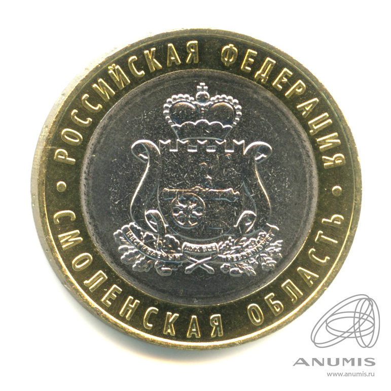 Юбилейная монета: 10 рублей 2025 года «Смоленская область». Российская Федерация. Российская Федерация: Россия современная (1997 — 2020). Монетный двор: Московский монетный двор, г. Москва. Биметалл, 8 г, ø 27 мм, Гурт: Рубчатый. Тираж: 1 000 000 шт. Серия: Российская Федерация.