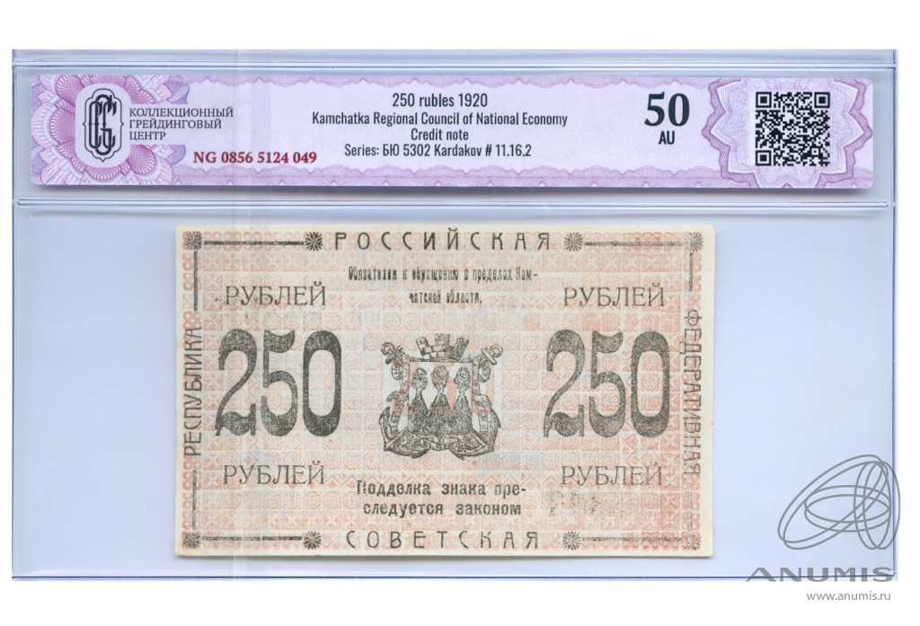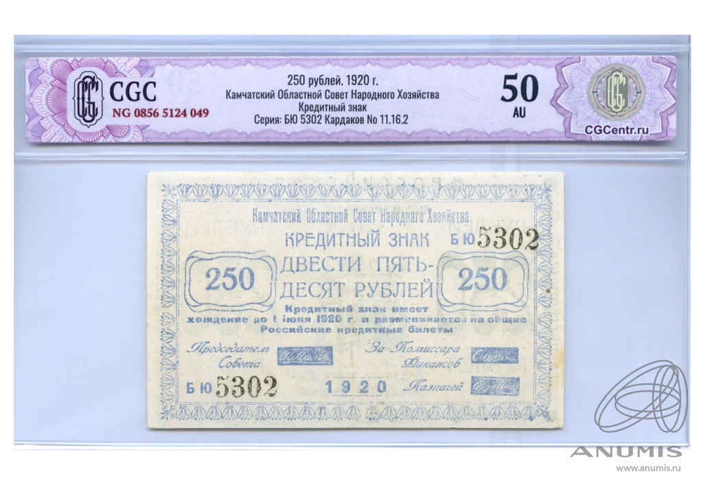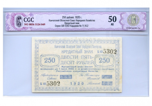 250 рублей — Камчатский Областной Совет Народного Хозяйства 1920. В слабе CGC — AU 50