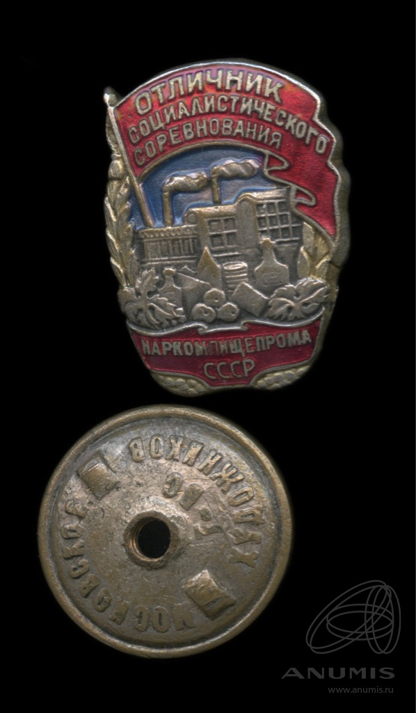 Знак «Отличник соцсоревнования Наркомпищепрома СССР». Крепление: винт. Тяжелый, эмаль. Бронза. Серебрение