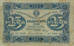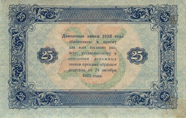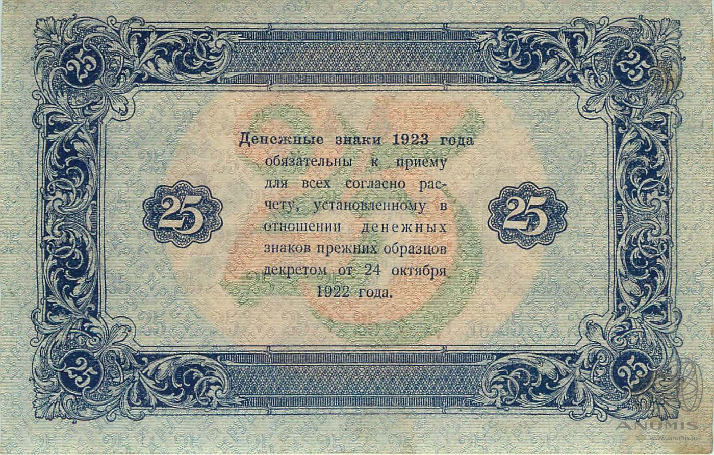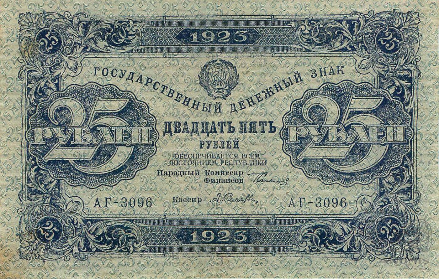Банкнота регулярного выпуска: 25 рублей 1923 года «2 выпуск. Нарком фин. Сокольников. Селлява». Денежные знаки 1923 г. Второй выпуск. Российская Советская Федеративная Социалистическая Республика: РСФСР (1919 — 1923).