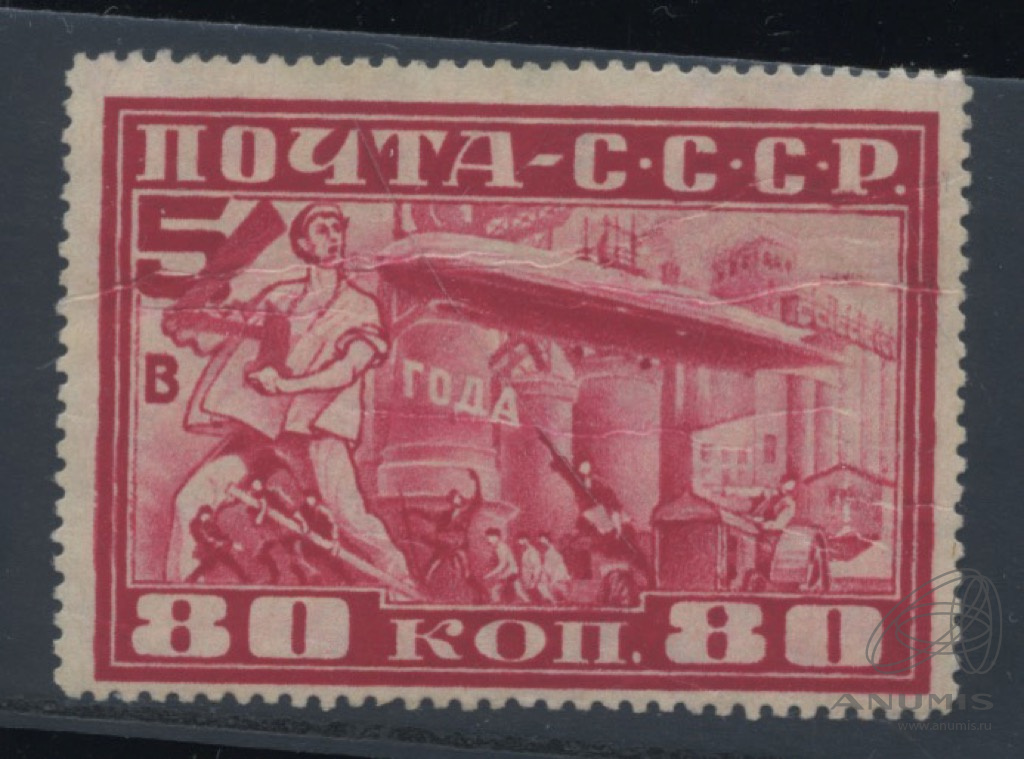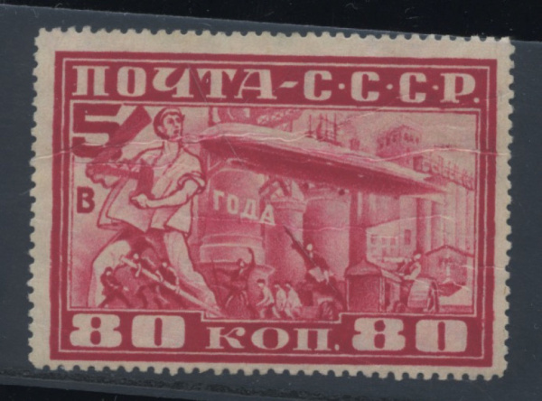 Почтовая марка СССР 1930 года номиналом 80 копеек из серии, посвященной полету дирижабля LZ 127 «Граф Цеппелин» в Москву и лозунгу «Пятилетку — в четыре года!»