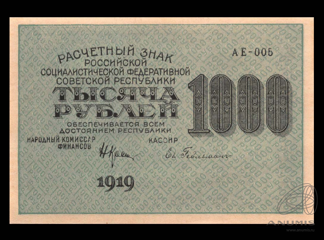Банкнота регулярного выпуска: 1000 рублей 1919 года «ком. Крестинский. Гейльман». Расчетные знаки РСФСР 1919 г. «Совзнаки». Российская Советская Федеративная Социалистическая Республика: РСФСР (1919 — 1923).