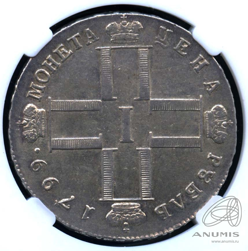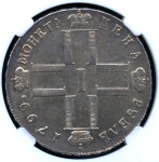 В центре изображена крестообразная монограмма, состоящая из 4 букв «П», увенчанных императорскими коронами и римской цифры «I» в центре. Вдоль канта круговая надпись: «МОНЕТА ЦЕНА РУБЛЬ 1799.», разделённая на 4 части императорскими коронами.