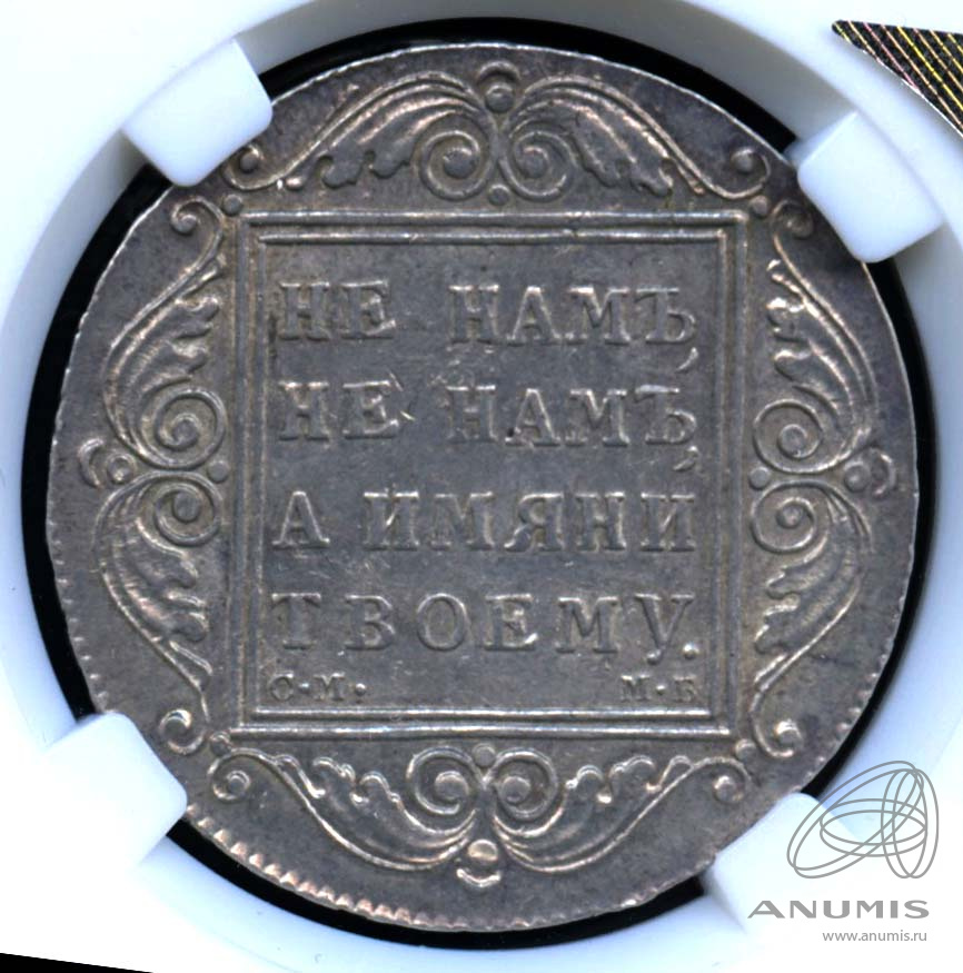 В центре изображен картуш с надписью в четыре строки: «НЕ НАМЪ"│"НЕ НАМЪ"│"А ИМЯНИ"│"ТВОЕМУ.». Под надписью буквы: слева — «С.М.», обозначение Санкт-Петербургского монетного двора, справа — «М.Б», инициалы минцмейстера Михаила Бобровщикова.