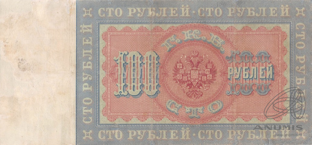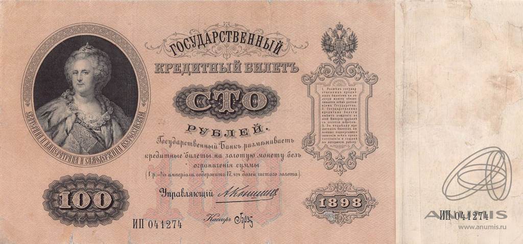 Банкнота регулярного выпуска: 100 рублей 1898 года «упр. Коншин. Брут». Государственные Кредитные Билеты 1898 — 1912 гг. А.В. Коншин. Российская Империя: Николай II (1894 — 1917).